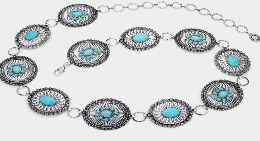 Western style old silver finish, squash blossom embellished with natural turquoise stone. Versatile waist or hips, jeans, shorts, or dresses.